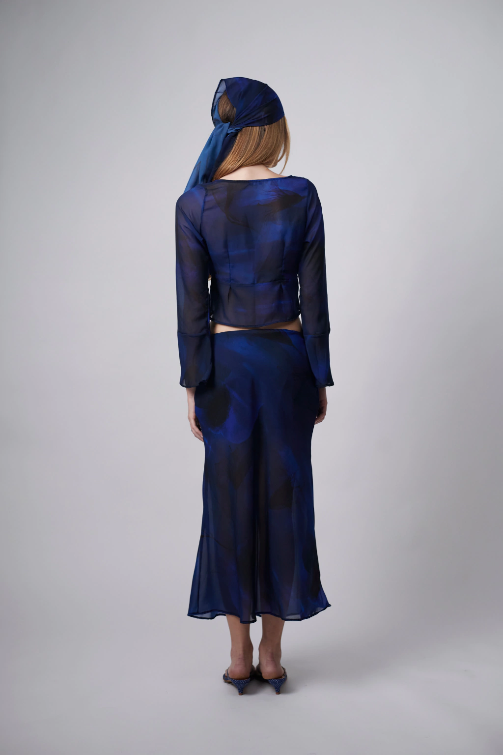 nossa estampa traduz liberdade e serenidade: o azul do céu se encontra com flores abstratas, criando um universo só nosso. | estampa exclusiva criada pela artista brasileira maria clara quartezani.