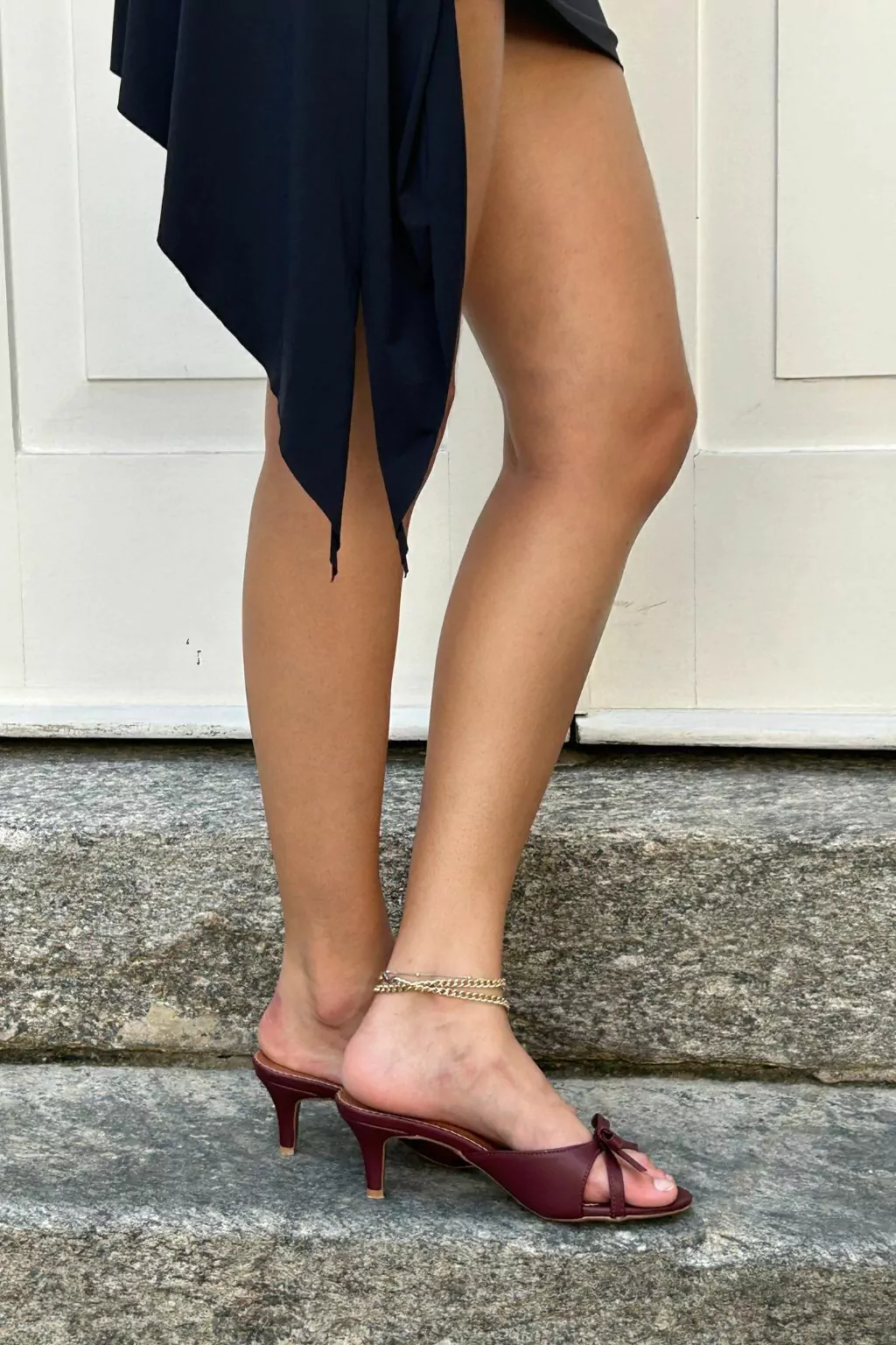 o design, sandália mule de couro, com salto baixo fino e um laço minimalista na parte superior,