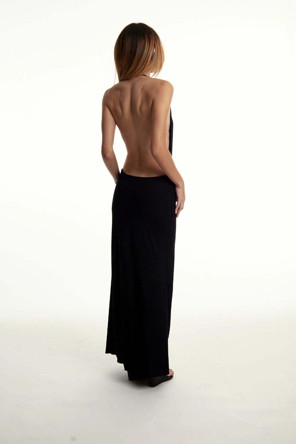 nas costas, o desenho totalmente aberto é o principal ponto de destaque: um recorte profundo que revela a pele e equilibra sensualidade com simplicidade. a saia longa acompanha o corpo de forma natural, com movimento sutil e toque macio do tecido.